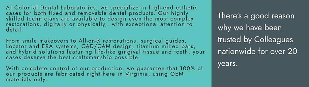 As a full-service dental laboratory, we maintain complete control to ensure that 100% of our products are fabricated in-house. We proudly stand behind our restorations, designed to last a lifetime, with guaranteed zero outsourcing and a three-step quality control process to ensure every product meets the highest standards. We also offer no-cost consultations and clear, dependable communication you can count on.